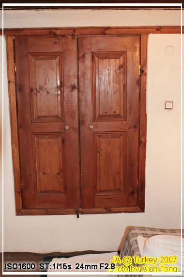 進了房間, 先拍拍房間的布置. 純木造的房間, 古意盎然. 床有微微凹陷, 看起來就知道睡起來不舒服. 窗子, 衣櫥的門栓, 十分簡單, 就是一個能轉動的小木條.