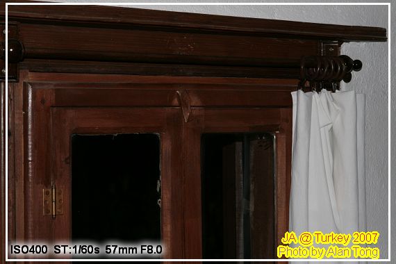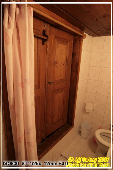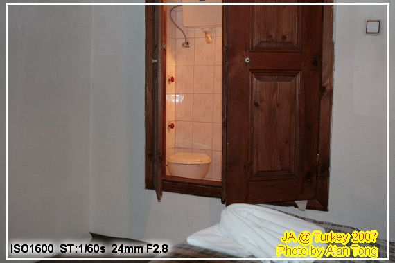 腦子裡正在胡思亂想, 突然聽到門外同團夥伴的聲音(是的, 門關上了, 聲音還是很清楚 ), 浴室在衣櫥裡. 什麼, 沒聽錯吧, 浴室在衣櫥裡? 這時 J 也想起來在電視上有看到過, 番紅花城有些老旅館, 浴室在衣櫥裡. 於是打開大衣櫥, 哇, 衣櫥裡真的有浴室, 還有馬桶呢! 真是, 門檻做得那麼高, 實在想不到那個不是衣櫥, 是浴室門.