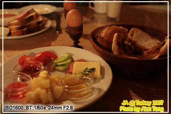 飯店的早餐, 在狹小的餐廳裡吃, 餐點, 麵包都算一般, 印象深刻的是蕃茄很甜.