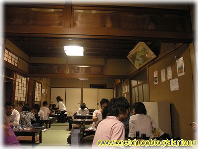 放好鞋子, 拐了個彎, 眼前全是榻榻米, 座墊, 和矮桌子, 牆壁是陳年的木牆, 就像在日劇裡看到, 要跪坐著吃飯的場景, 剛進去時, 還戰戰兢兢地跪著, 後來發現當天在場的全是年輕人, 除了我之外, 根本沒看到有人跪坐, 而且連盤坐也欠奉, 多數是大刺刺地坐在地上, 還不忘叨著煙吞雲吐霧. 既是如此, 當然也不必跪得腳痠腿麻, 也從善如流地坐了下來.