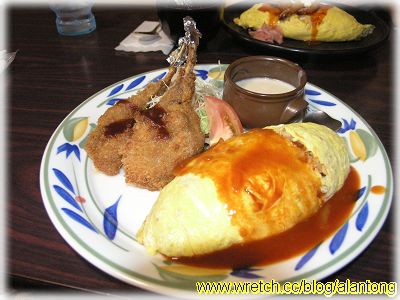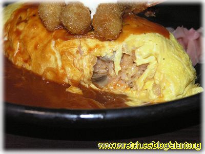 忍著誘惑拍完照, 開始品味美食, 滑嫩柔順的蛋包裡, 是拌著小小牛肉塊的炒飯, 雖然只是小小的肉塊, 但牛肉的味道仍是香濃. 而附上的兩隻小牛排, 直是鮮嫩多汁的最佳解釋, 不過還是蠻懷疑的, 雖然菜單上寫的是牛排, 不過肉看來是白肉, 可是入口的軟嫩感, 又非是豬肉或雞肉, 而附著的小骨頭, 也不像是豬或雞骨, 既然無法分辨是什麼肉, 就當作是菜單的上小牛排吧, 反正美味可口, 是什麼肉又有何妨?