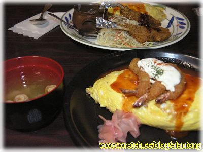 看了半天的 menu, 還是不知道在寫什麼, 看來只學了幾個星期的日文是不夠的, 只好厚顏地跟小姐說需要英文菜單. 本來預計二個人都要點雞肉蛋包飯的, 不過因為看到了有書上沒寫的新菜單, 所以當然將一份雞肉蛋包飯換成了新的牛肉蛋包飯加小牛排組合, 點這個組合只要多 150 就可以點原價要 300 多的飲料一杯, 牛肉蛋包飯的組合那麼豐富, 雞肉蛋包飯自不能孤零零地, 點蛋包飯多加 336, 就可以有三隻炸蝦和一碗味增湯, 至於飲料就沒優惠了, 得要另外點.