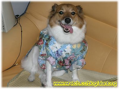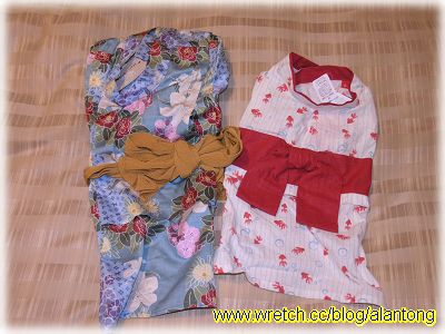 回到難波, 走到日本橋( 忘了在前一站下 ), 機緣巧合下, 在難波往日本橋站的地下商店街, 出口 B23 ~ B25 之間, 發現了一間服裝店, 除了賣年輕人的衣服外, 有一半在賣小狗子穿的衣服. 一般在台灣常見的款式當然不缺, 獨特日本風的浴衣更是不會少. 精挑細選下, 買了二件, 一件在 2500 日幣左右的浴衣. 一件是給小黃的, 另一件就看看美麗福三姐妹中的美麗誰能穿囉!
