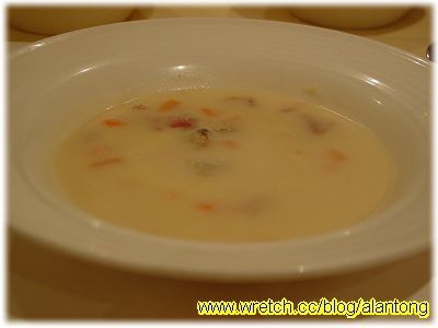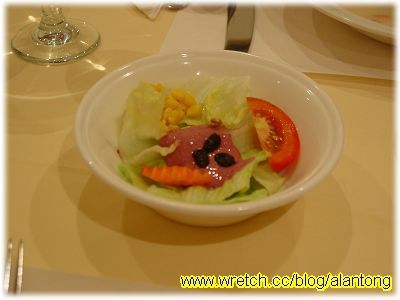 先上桌的是沙拉和前湯, 沙拉裡的生菜, 當然是和別人相同, 花樣再變也有限, 不過裡頭的沙拉醬可是帶著一點兒創意, 淡淡的葡萄味和奶香. 前湯的料就令人訝異了, 海鮮濃湯雖然口味中上, 但是湯裡頭居然有蛤蜊和培根, 而且份量不少, 因為如此, 整碗湯喝起來, 有點幸福的感覺.