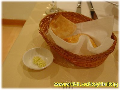 接著是烤得香酥的三角麵包, 可自個兒塗附上的大蒜奶油, 雖然大蒜味不夠香濃, 但外層又厚又酥的麵包吃來也是不錯.