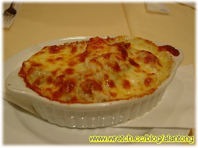 星期二的晚上, 客人並不多, 除我們外, 只有一二桌, 客氣的室友只點了白酒蛤蜊義大利麵, 減肥中的 A 也就點了個海鮮焗飯吃吃, 順便和小東河十號比較一番.