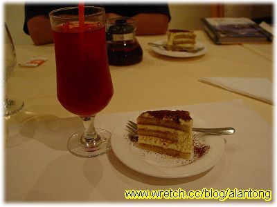 最後還有提拉米蘇, 咖啡酒的香甜, 被海棉蛋糕吸得滿滿地, 還有淡淡的起司香, 配上隨餐附贈的冰水果茶, 作為結尾也是不錯. 室友點的熱水果茶, 喝完後, 小姐還會主動來問是否加沖, 不過在小姐來問前, 室友己把果粒都吃光了...