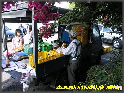 晚上近七點到茲心園 check in 時, 看到有輛小發財車正在收拾, 隔日一早吃早餐時, 又發現小發財車又出現, 而且車前人來人往, 生意興隆, 於是也靠近看看有沒什麼好東西. 老闆是位老先生, 會講國語和閩南語, 姑不論水果是否好吃, 可那位歐吉桑可真是有趣的人. 老闆不給殺價是正常的, 可一般老闆只會說不行, 或是說只能減多少, 可是那位歐吉桑的回答真的蠻有趣的.