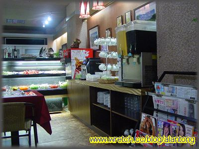 雖然客人不多, 可是橙果的自助式吧台, 材料仍豐富. 尤其是濃湯中為數眾多的秀珍菇, 以及清湯中怎麼撈怎麼中的蛤仔. 另一邊的飲料機, 和常見的飲料機一般, 是一深一淺兩種顏色的飲料, 不過喝起來和一般的卻大不相同. 深色的是酸梅汁, 味道紮實, 帶有濃濃的酸梅, 烏梅和仙楂香. 淺色的是蘋果汁, 雖然不見得是新鮮現打, 卻也調得頗有味道. 雖然是免費的附湯, 飲料也可感到老闆的用心. 而且每吃過一道, 服務生都會來收盤子, 不會拖很久.