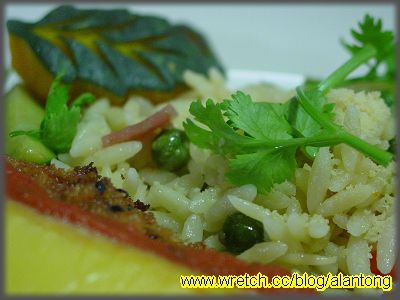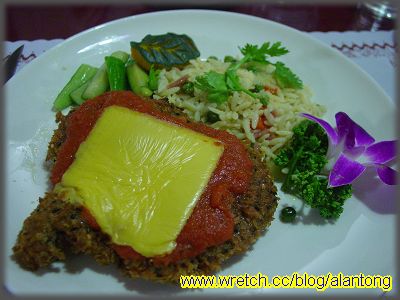 A 的起司焗牛排, 就有點難形容了. 牛排外層裹著麵衣, 麵衣上雖有芝麻, 但口感實在有點像快餐店的炸排骨, 幸好裡頭的牛肉還不錯. 而上頭也是舖上層蕃茄醬汁後, 放上一塊起司. 說真的, 方形的起司大喇喇地放在牛排上, 賣相實在欠佳. 沒有去過義大利, 不知道真正的義大利料理有沒這道有趣的牛排, 不過抱怨歸抱怨, 還是不錯吃, 不過就沒焗海鮮飯來得好吃. 雖是如此, 也有值得一提之處, 就是一旁的米飯是長條形的米飯, 不確定是否就是義大利的米, 但形狀和在捷克吃到, 由義大利人做的套餐中的米是相同的, 老闆有為台灣人的口感調整過吧, 所以長米是完全煮透的, 不像義大利人做的, 裡頭還有硬蕊.