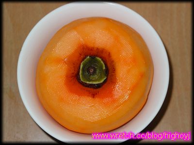 另外, J 吃柿子的方法, 雖然不見得最好吃, 可是一定是最讓人流口水的吃法. 就是先將整顆削皮, 放在碗中, 拿起一根叉子"度"進去, 然後整顆叉起來啃, 每次在旁邊看到 J 的吃法, 總讓A 口水直往肚裡吞.