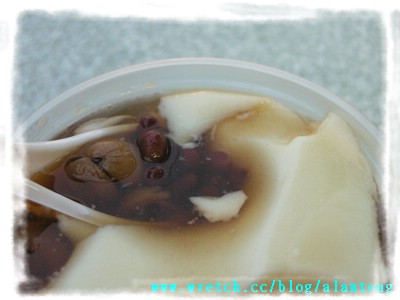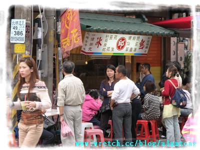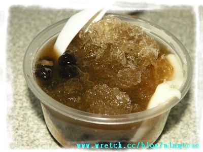 老闆問我們是否要加豆花, 當然是加上豆花, 口味更豐富. 湯裡的桂圓雖然大小不一, 可是肉都很厚, 仍舊帶著重重桂圓香, 不像很多桂圓湯裡的桂圓煮出味後, 本身就沒味道了, 但是是沒熬出味來嗎? 並不是, 桂圓湯仍有香濃桂圓味, 想來是先煮好桂圓湯, 再多放桂圓進去, 才能同時有香濃的桂圓湯和桂圓肉. 湯裡的豆花滑嫩, 紅豆軟爛, 所以 A 又加點了冰的粉圓豆花, 加上 J 要的薑汁. 薑汁很夠味, 不過冰的薑汁喝來總有點兒不大對頭. 粉圓外頭很 Q, 不過中央還有點硬, 是美中不足之處.