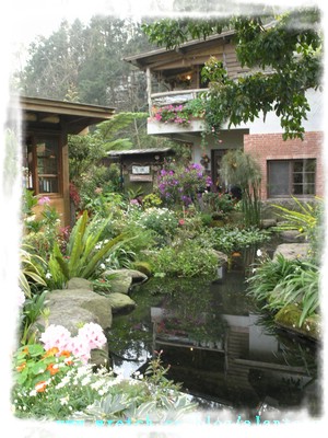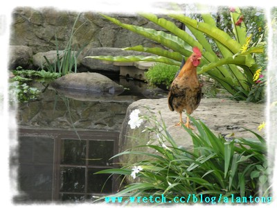老闆養了隻苗條的公雞, 在碎石地上漫遊, 神奇的是, 他還聽得懂主人的呼喚, 拍拍翅膀越過了造景的小溪, 而後振翅飛上枝頭, 引吭.