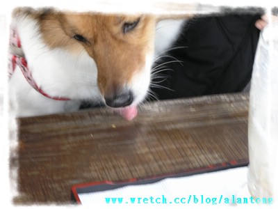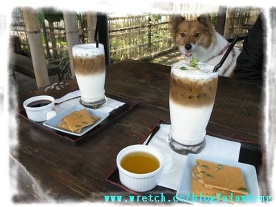 帶著阿黃進去, 雖然老闆只不讓寵物進室內, 不過還是建議我們帶阿黃到寵物專區, 空間較大, 只不過寵物專區同時也是吸煙區, 對煙味很敏感的 A, 坐起來就不是那麼舒服. 幸好挑在上風處, 微風起時, 煙味也隨之而逝.