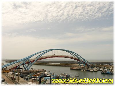 鋼拱橋在永安漁港, 畫出圓滑的曲線, 據說夕陽西下時, 隔著拱橋看落日, 更是美麗, 可惜一週來每天睡不足六小時的 A, 撐不到那時候.