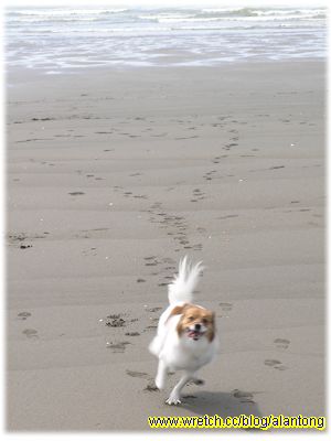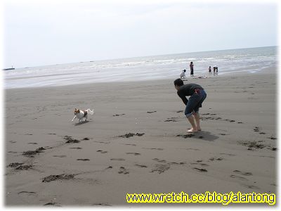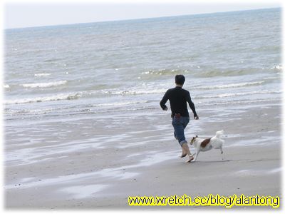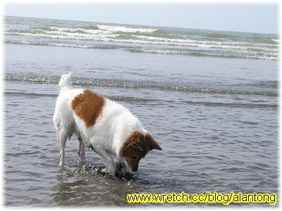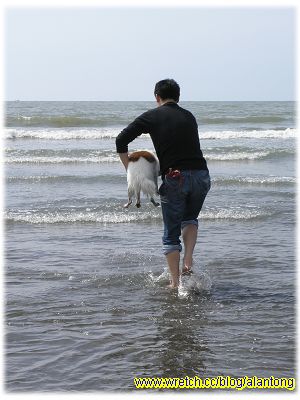 第一次離海邊那麼近的阿黃, 雖然亂跑, 可就不敢離有波浪的地方太近. 捲起褲管, 半哄半騙地, 跟阿黃一路玩到海水中.