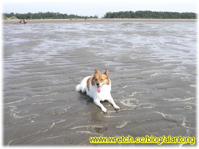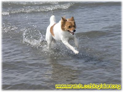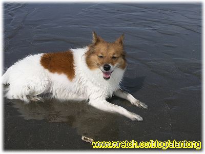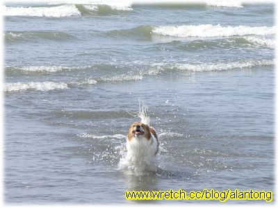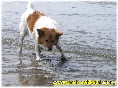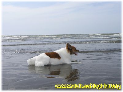 可黃小胖, 胖是有原因的, 到了海邊, 可能是二點的陽光太大(實際原因應該是黃小胖太懶), 一碰到海水, 立時趴了下來, 把肥肚腩浸到水裡消暑, 不過趴著趴著, 還三不五時換位置. 如是者三五次, A 可發現了阿黃的小秘密, 原來皮得要命的臭小黃會怕海浪. 趴在地上, 浪一陣過來, 他就馬上站起來換到離岸更近處, 水一退, 她又往前至肚子泡得到水處.