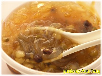 輾轉到了正黃家, 被膩著的二人, 深怕再被膩一次, 想說要不二人叫一碗, 不過看到別人桌上的份量都不大, 於是鼓起勇氣一人一碗. 正黃家有三種口味, 綠豆蒜, 綠豆蒜加粉條, 綜合(綠豆蒜加綠豆, 加粉條), 我們點了綠豆蒜加粉條和綜合. 正黃家的糖水並不特別香濃, 所以嚐得出綠豆蒜本身的清甜, 粉條咬勁足, 嚐得出澱粉的香氣, 一小碗實在不過癮. 在回程, 我們又到正黃家帶了不少碗.
