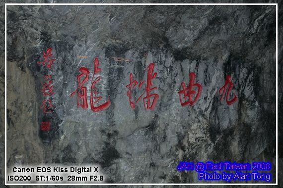 一路曲折, 在九曲洞的中央, 發現四個有力的大字, 九曲蟠龍. 是啊, 曲折的山路立在險峻的山谷, 多變的巨石之旁, 不正像巨龍升天時, 龍軀擺動的曲線嗎?