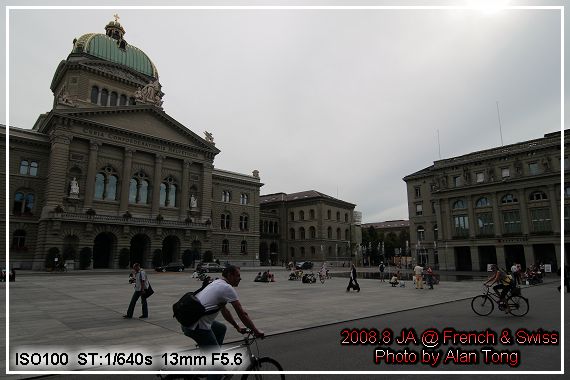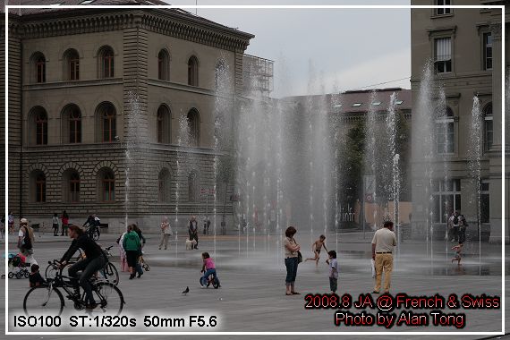 逛過熊公園, 往伯恩市區前進. 目標當然是號稱總長六公里的購物長廊. 前進的路上, 發現一個偌大的廣場, 上頭偶爾噴著水, 小朋友在水柱上方嬉戲, 年青人則三三兩兩坐在廣場上聊天. 問起導遊, 這是哪兒, 怎麼大家一派悠閒樣. 得到答案是"立法院" ( 上網查了一下, Curia Confoederationis helveticae 是議會, 國會, 的確台灣的立法院 ) 這和我們的立法院前三不五時堆滿抗議民眾, 實在有點落差.