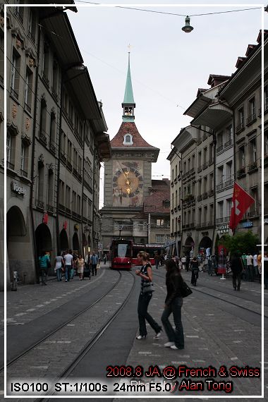 在二側商店街的中間, 是行人步道, 車道和--電車道. 是的, 沒有欄杆, 沒有阻隔, 電車鐵道就這麼和行人交錯. 唯一提醒大家注意的, 大概只有電車前進的聲響和快撞上時的鈴聲吧. 雖然覺得有點亂, 有點危險, 可是在伯恩, 行人, 自行車, 汽車, 電車, 就這樣亂糟糟地混在一塊兒, 混出一種特別的城市風情.