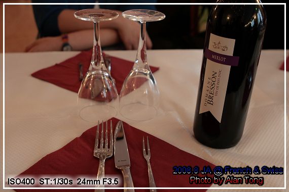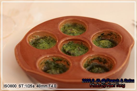 田螺裝在我們熟知的容器裡, 用叉子慢慢叉起來品嚐, 軟中帶 Q 的田螺, 配合香噴噴的佐料, 口味不錯, 不過和台灣不錯的餐廳相比, 算差不多好吃, 沒有預期中法式田螺令人驚豔的感覺. 後來在電視節目中看到, 原來有些田螺餐, 還要用特別的餐具夾田螺殼, 挖田螺肉, 完全不是我們一般的吃法呢.