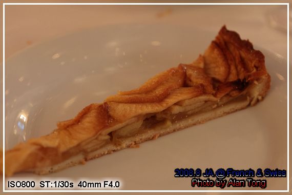 餐後甜點是蘋果派, 肉桂味明顯, 蘋果不夠香甜, 派皮有點軟, 不夠脆, 是普通的蘋果派.