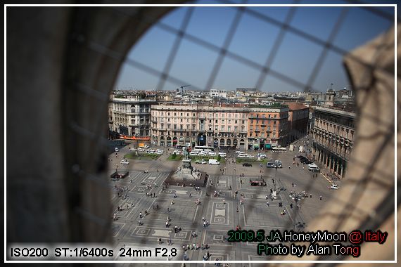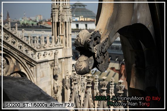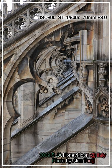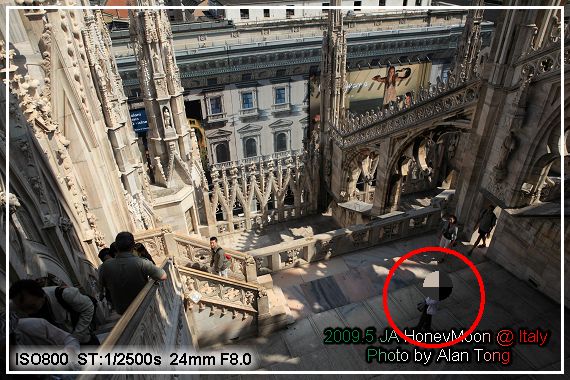 這張照片很特別, 是位有懼高症, 沒辦法爬上教堂頂的小姐, 躲在一半高度拍下的, 命名為"懼高症者眼中的金色聖母". 雖說是由爬不上教堂頂的 J 構圖, 可是這角度, 這取景, 實在叫辛苦爬上樓頂, 還特別換上廣角鏡的 A 汗顏呀!