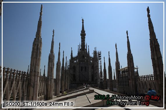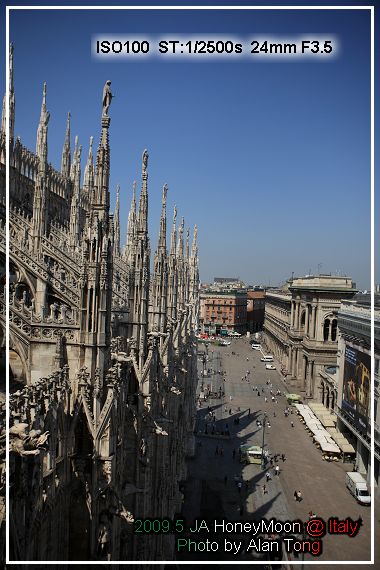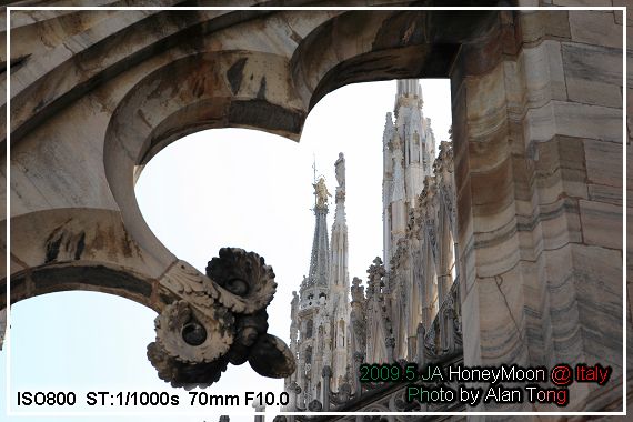 米蘭的 Duomo, 1386 年米蘭大公下令興建, 1800 年代, 拿破崙指揮下完成鐘樓, 1887 年再建造尖塔, 由興建到完工, 足足是 500 年的悠悠時光.