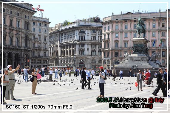 首先進入大教堂廣場, 廣場上最令人注目的, 除了大教堂外, 就是滿滿的鴿子, 以及廣場上的銅像. 鴿子完全不怕人, 就和人群一起在廣場上漫步. 而廣場上銅像, 則是義大利第一位國王 -- 維克托艾曼紐二世. 義大利許多城市都有以其為名的道路, 前文艾曼紐二世拱廊即是一例, 有點像是咱們的中正中山路...