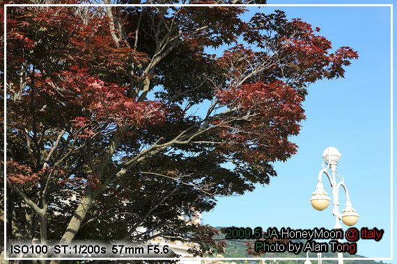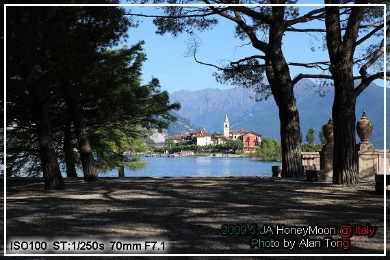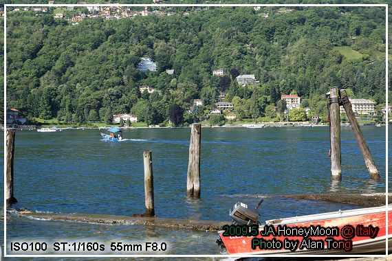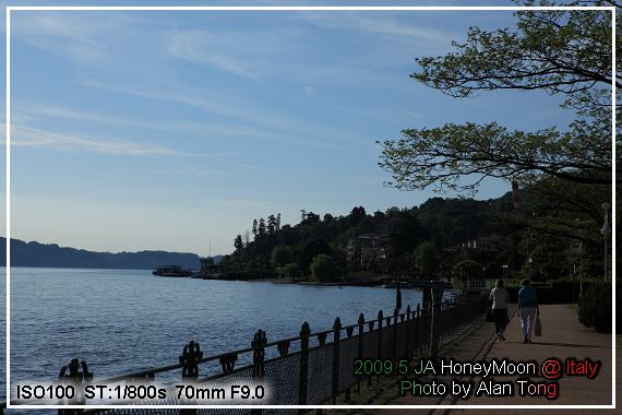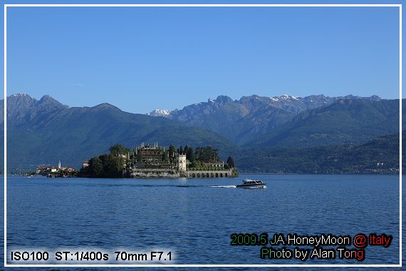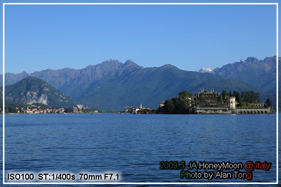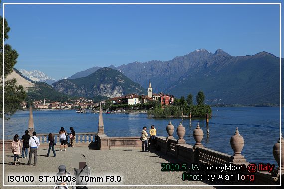 在湖畔拍下幾張早上的 Maggiore 湖光, 湖上被大家拿來當背景, 最引人注目的, 就是待會的目的地, 貝拉島 (Isola Bella ).