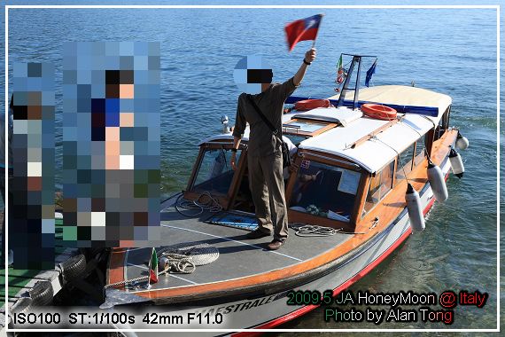 原以為要再花時間走到昨天看到的碼頭, 不過接我們到島上的小船, 就直開到飯店前的小碼頭, 令人吃驚的是, 船上還掛著國旗呢! 想來是今日是哪團客人, 船長就會準備好家當吧.