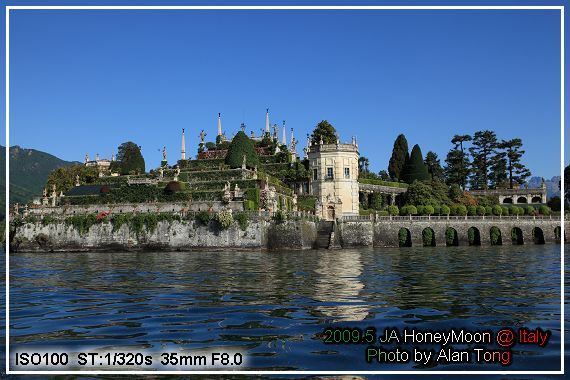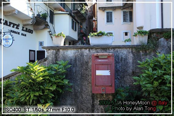 牆上的郵筒, 彷若陳述著歷史, 不知有沒有一段屬於 Isola Bella 的海角七號. 不過, 貝拉島, 可能不需要海角七號的故事, 因為島名已是個浪漫的故事. 在十六世紀時, 擁有馬久里湖上群島家族中的波羅緬歐三世( Charles Borromeo ), 為紀念他的妻子, 伊莎貝拉, 特地請了建築師 Angelo Crivelli 協助其開發這座小島, 包括我們看到的宮殿, 以及那美麗的花園, 之後, 這島就名為貝拉島.