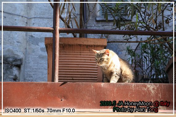 沿著指標尋找洗手間, 洗手間屋簷上方的貓咪注視著我們, 遊客也注視著貓咪. 我們覺得他可愛, 想拍張照, 可貓咪心裡在想什麼呢? 可能在抱怨悠閒的好眠被不速之客打斷吧.