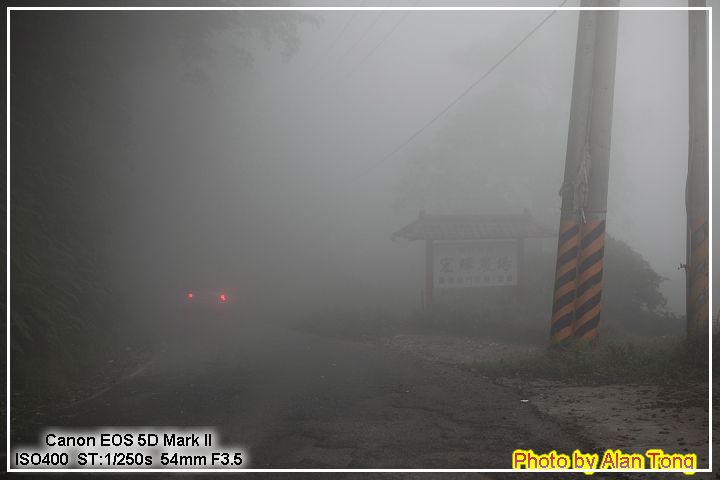 十幾分鐘前, 還因為看到霧氣而心情大好的 A, 現在深深後悔沒早早下山. 濃濃的霧氣, 對行人而言, 對山景來說, 是一大美景因素, 可是對開車來說, 真是又驚又險!