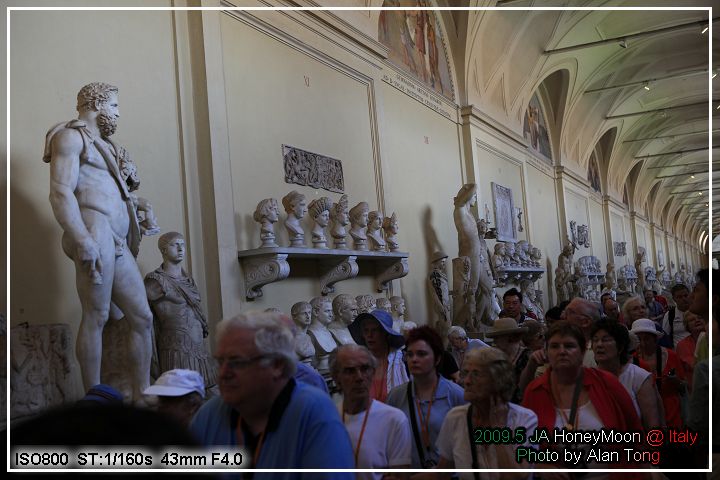穿過庭院, 先進入雕像室, 一座座美麗的雕像, 就成排地陳列在展覽廳中, 要不是排列得算整齊, 這滿滿的雕像, 還真會讓人以為是進入倉庫呢! 進入博物館開始, 可以拍照, 但不能用閃光燈, 也不能開對焦輔助燈. 對焦輔助燈就是有時候在光線不足時, 相機會自己打出來的光線, 多是一個圈圈, 有紅有橙有綠, 不過大多數人可能不知道, 所以整座博物館內, 雖然少有閃光燈, 不過各色光圈, 還是到處跑來跑去.