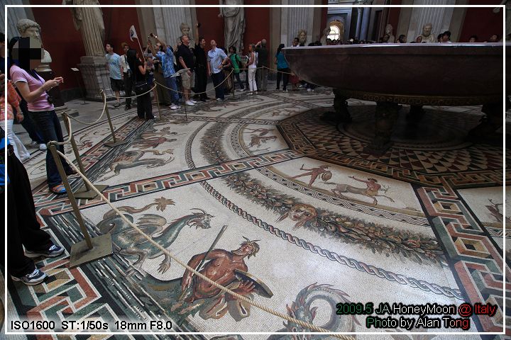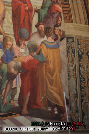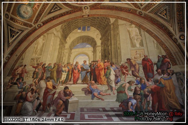 走出美術館進入"拉斐爾室", 展覽室裡擠滿了人潮, 因為牆上是著名的雅典學園. 不知哪個求學階段, 課本上有圖中柏拉圖和亞里士多德的插畫, 親臨現場, 看著那幾乎與人同高的人物, 一恍神彷彿也進入了那熱鬧的場景!