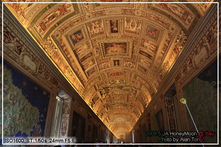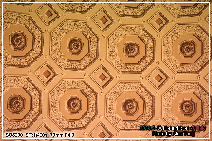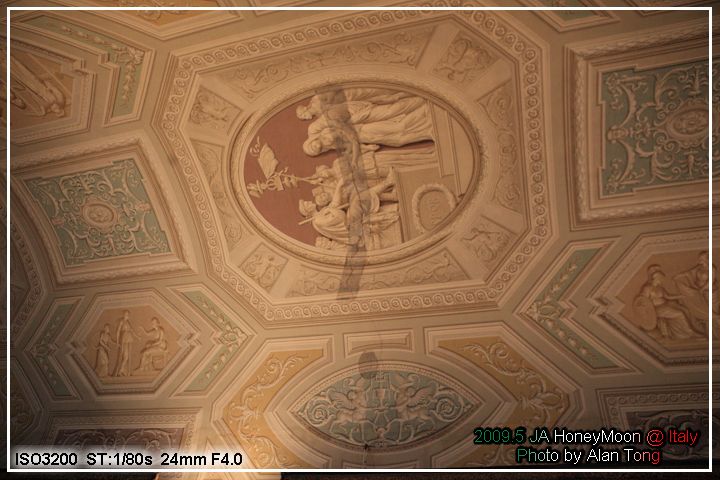 除收藏外, 美術館本身就是了不起的藝術作品. 各種華麗的天花板, 華麗的金光, 讓美術館顯得華貴明亮. 讓 A 一直不敢相信的, 是這些"立體"的天花板. 許多資料和導遊, 都說天花板是用畫的, 那立體感純是畫家對光線明暗的精確掌握, 讓我們由下方觀看時, 會誤以為是立體的天花板, 可問題是, 就算心裡知道正確答案, 當看著那"立體"的天花板時, 心裡冒出的疑問, 並不是"天花板真是用畫的嗎?" 反倒是換了個角度 -- "導遊該不會弄錯房間, 搞錯走廊, 其實上方的是浮雕天花板吧!" 看看照片, 這到底是畫還是浮雕呢?