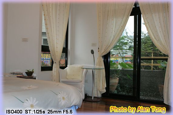 昏黃的燈光點亮溫馨的房間, 阿黃看來也喜歡這兒的環境, 開心地在房間繞來繞去. 床頭上有長長的蕾絲罩, 陽台有個小花圃, 浴室裡還有大大的檜木桶. 美樂家內的各個小角落, 也似隨意地放著據說是老闆娘的畫作, 以及各式各樣的書籍, 整個住宿環境著實不差.