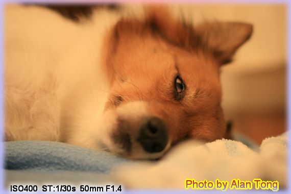 從市區回來, 再下樓幫趙三肥拍拍照, 就在洗過澡的檜木香中昏昏入睡. 至於玩了一天, 體力又不佳的阿黃, 早在吃光飼料後, 就半瞇著眼睛, 進入神遊的狀態...