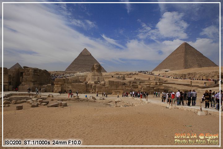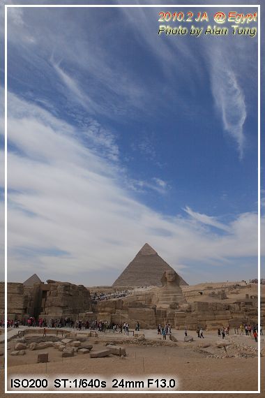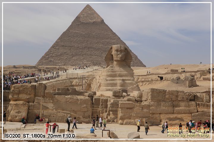 即使歷經數千年的風風雨雨, 人事更迭, 人面獅身和其後方的金字塔, 仍在藍天沙塵間傲立.