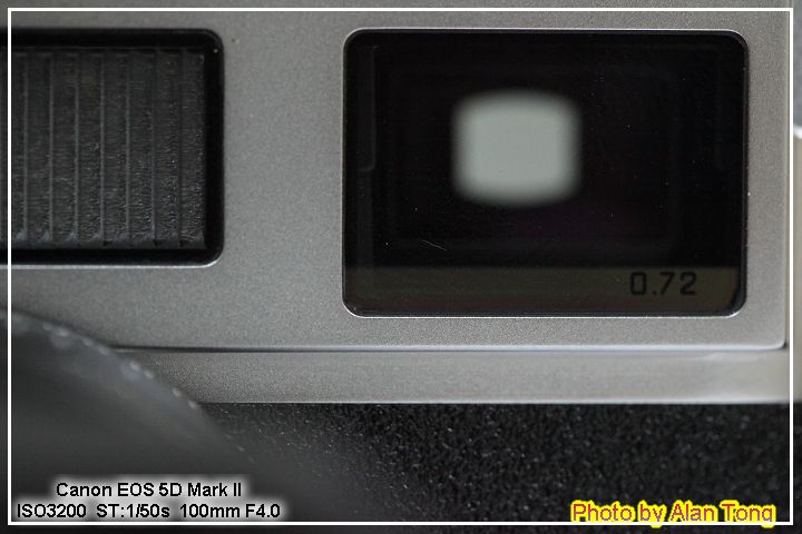 右側上方是觀景窗, 有小小的 0.72 字樣. 雖是 0.72, 不過對戴眼鏡的 A 來說, 看 35mm 的框線還是得調整眼睛位置, 不然沒辦法看到四個角落的框線.
