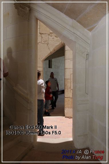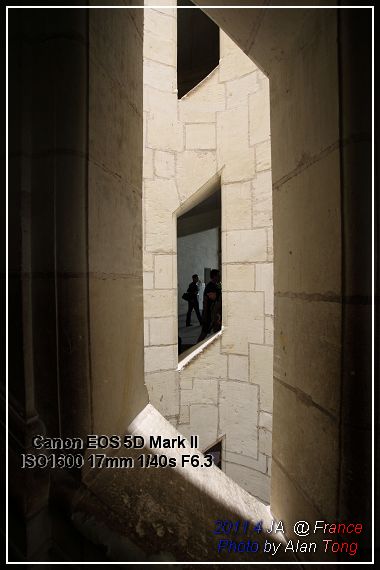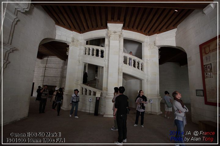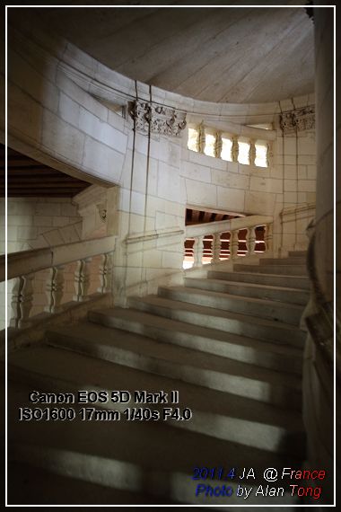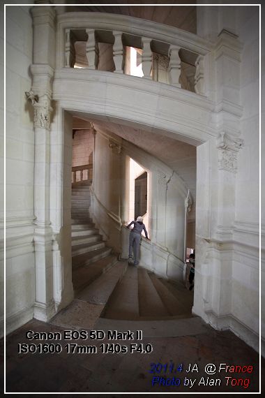 香波堡最特別處, 就是主塔以中間的雙絞螺旋梯為中心, 呈現完全四方向的對稱. 所以在參觀時, 得要找到通向側翼的走廊, 才不會被對稱的房間弄得暈頭轉向. 這十分特別的螺旋梯, 據說是 Franscos I 邀請達文西到法國作客時, 由這位藝術和科學的奇才所設計的, 也難怪嚴謹的雙絞弧線, 還傳遞出特別的美感.
