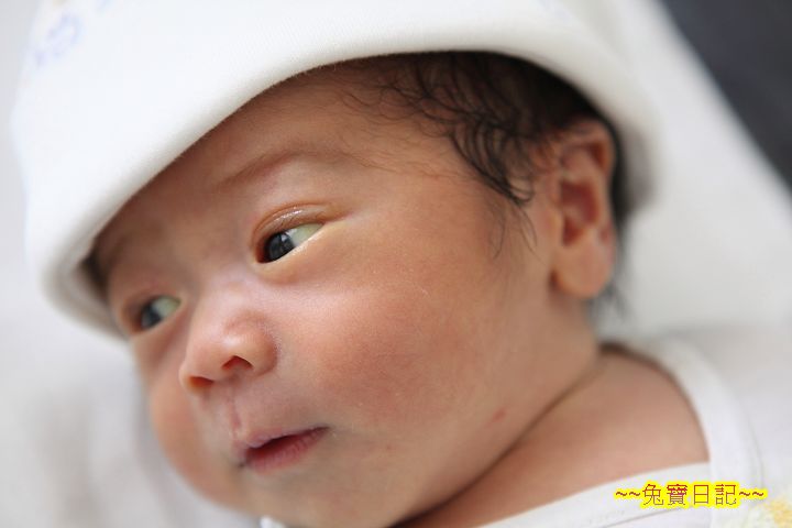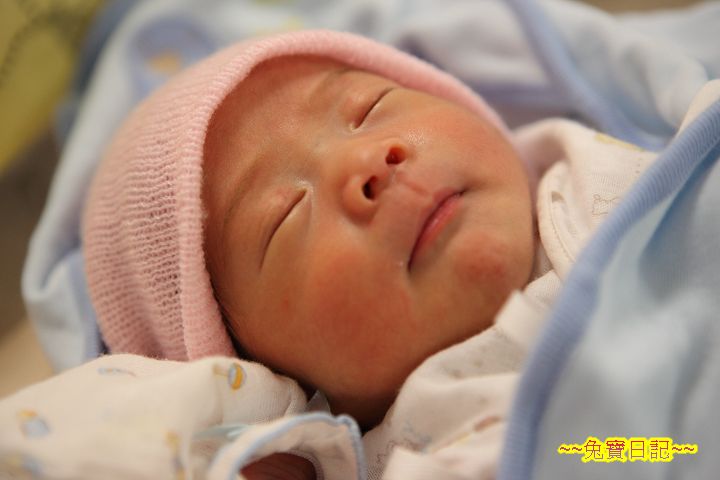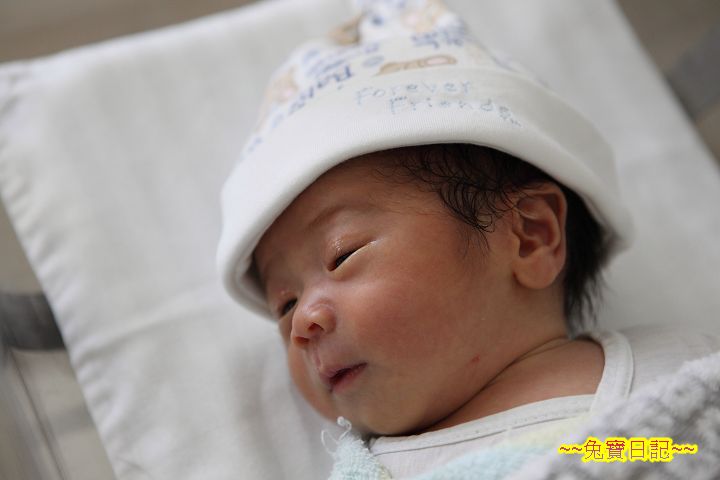 手忙腳亂地抱起阿乖, 交給沁月的工作人員, 停好車回到房間後, 阿乖已經在小床上睡著了. 換上幫阿乖買的帽子, 開始拍照, 啪啪啪, 啪啪啪! 可能是阿乖和自己的心情都很好吧, 這天早上拍下張超滿意, 自己很得意地認為像媽媽寶寶雜誌水準的照片... ^_^ ( 後來這張用來當 BLOG 宣布的照片, 以及彌月蛋糕小卡的照片 )