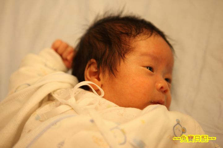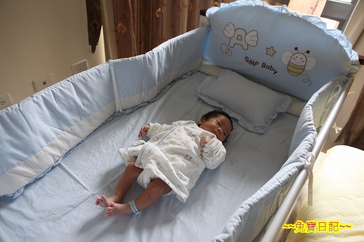 回到家, 在阿乖的小床上放下阿乖, 驚覺阿乖頭髮將要全濕, 看來是熱壞了. 唉, 阿乖跟著 JA 這對新手爸媽也蠻辛苦的, 怕阿乖感冒特地帶上的較厚衣服, 卻想不到在中午時分的太陽下, 即使車上吹著冷氣, 對包在安全座椅上的乖乖來說, 卻已太厚, 只是我們全不知道這樣對乖乖來說不舒服, 還傻傻地以為, 暖一點好, 暖一點好…