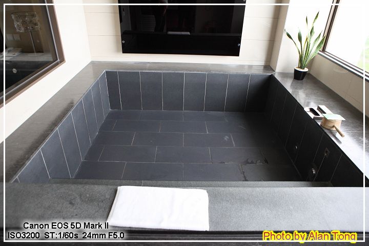 再向窗邊移動, 重點來了! 超級大浴池!!! 還外加奈米泡泡牛奶浴機! 身高 180 的 A, 不論直躺, 橫躺, 都碰不著邊, 窗外也沒比長榮更高的建築, 不擔心的話, 邊泡湯邊看夜景, 是很棒的享受. 大浴池旁也有電視, 不過這台除了拍照時有打開外, 就沒再開過了. ( 同事打趣說, 你們一家三口, 正好一人看一台. )