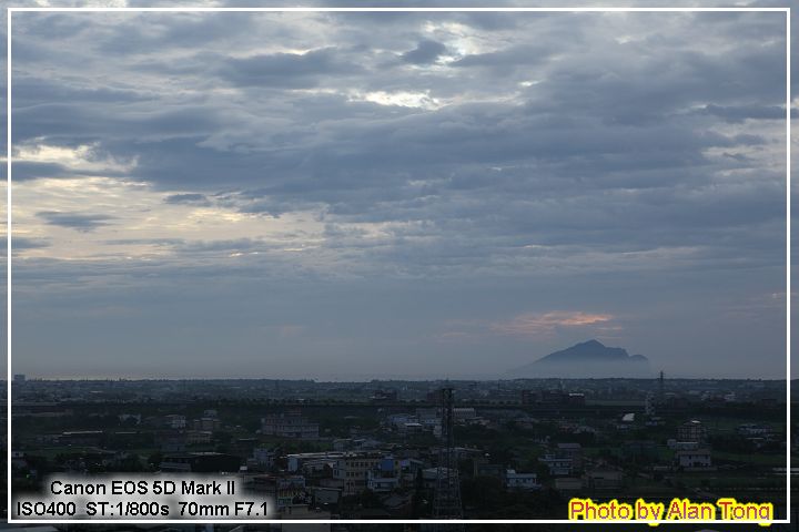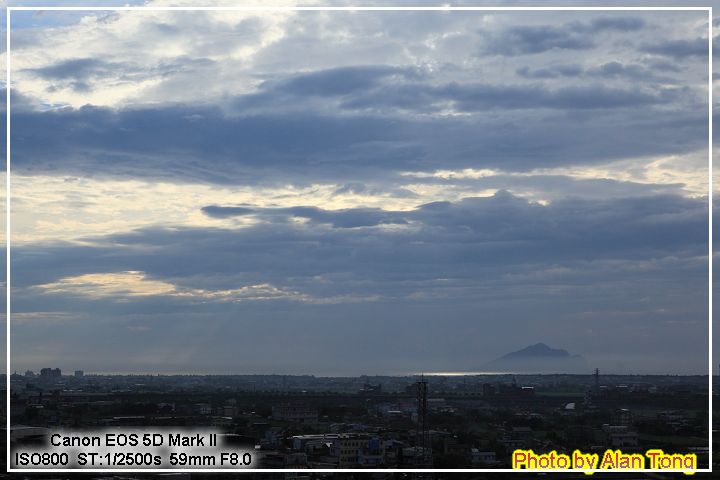 次晨, 雲霧略開, 龜山島彷彿處在雲霧之上, 加上前方正落下的一道金光, 讓人晨起精神為之一振.
