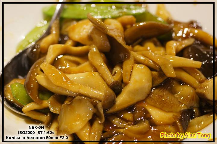 三菇六婆( NT240 ), 菇很多, 婆不知在哪, 不過火熱的溫度被封在甘甜的勾芡醬汁中, 加上菇類特有的口感, 很好吃的一道菜.