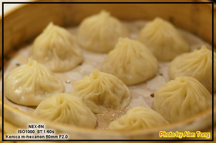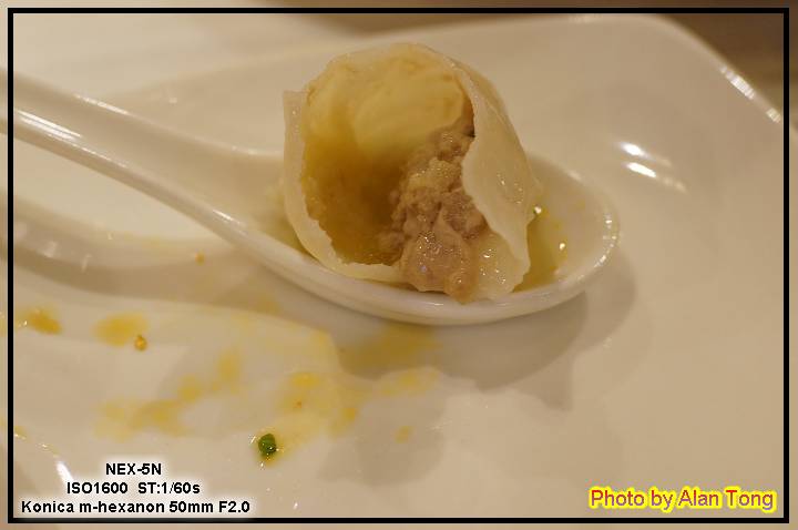 小籠湯包 ( NT180 ), 湯汁不少, 肉質緊實, 應該很好吃. 不過 JA 實在被鼎泰豐給寵壞了, 只覺還不錯, 而且上桌時, 十顆破了二顆, 有點糟.