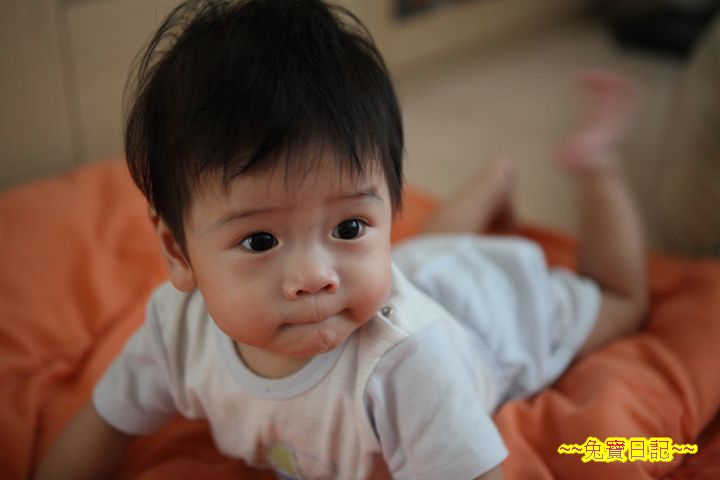 乖乖最讓人擔心的, 就是他的招牌動作之一 --心情大好時, 爬一爬, 會用力咚地一大下, 把臉給撞進彈簧床/軟墊裡, 然後再抬起頭來, 送出燦爛的笑容.